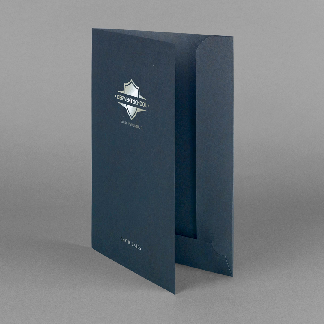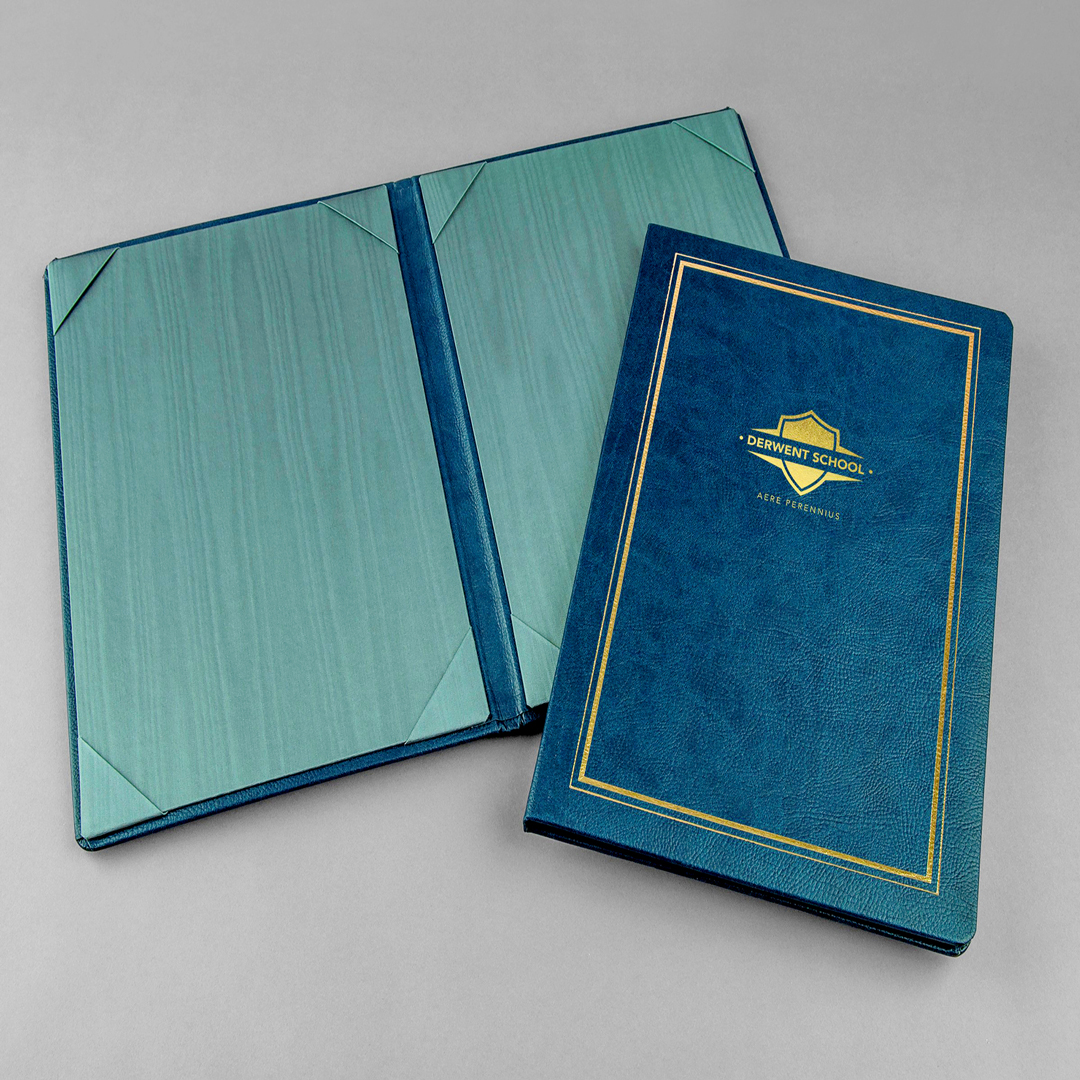 Customization options typically include foil stamping or debossing your logo and text onto the cover, along with choosing the folder's material and color.